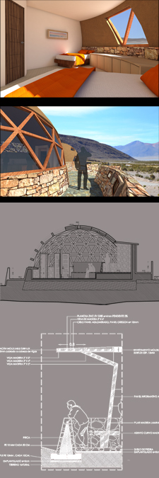 Fomalmente se descuelga del cerro a través de la fragmentación del volumen,manteniendo las texturas del lugar a través de una plaza conformada por terrarios y jardines secos.